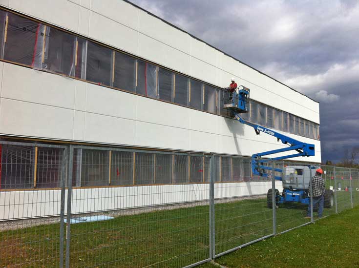 Our initial project for Siemens Canada in Peterborough, was the removal of the existing precast facade and window systems which were then replaced with new steel studs, insulation, sheathing and exterior finish insulation system (EFIS) as well as new and more energy efficient window systems.The second phase of the project was the renovation of the reception area, cafeteria and offices for this section of the building.